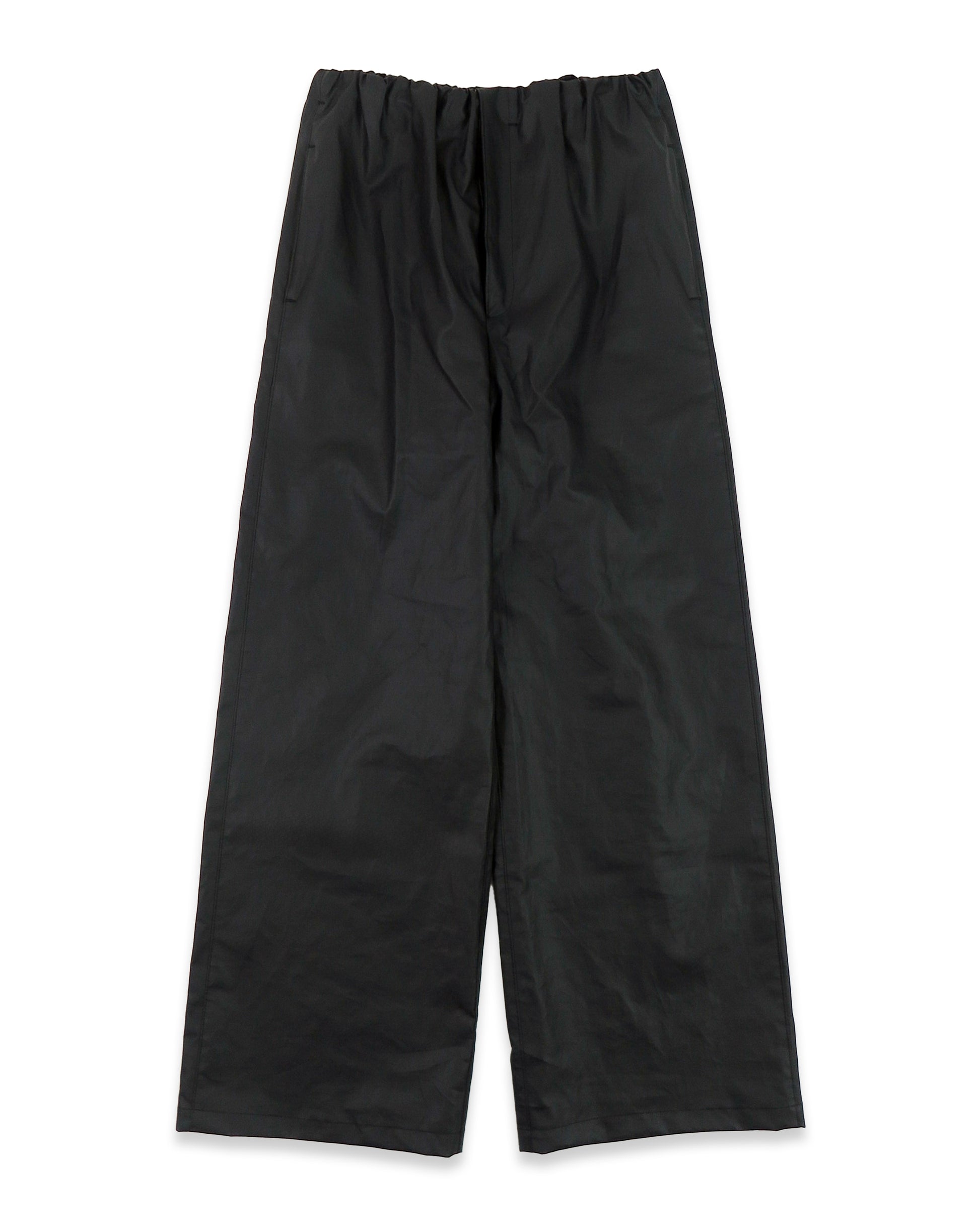 Relaxed trousers in Italian coated linen. Unisex. Mid waist. Straight relaxed fit. Fly. Side pockets. Concealed drawstring at elasticised waistband. Water resistant.